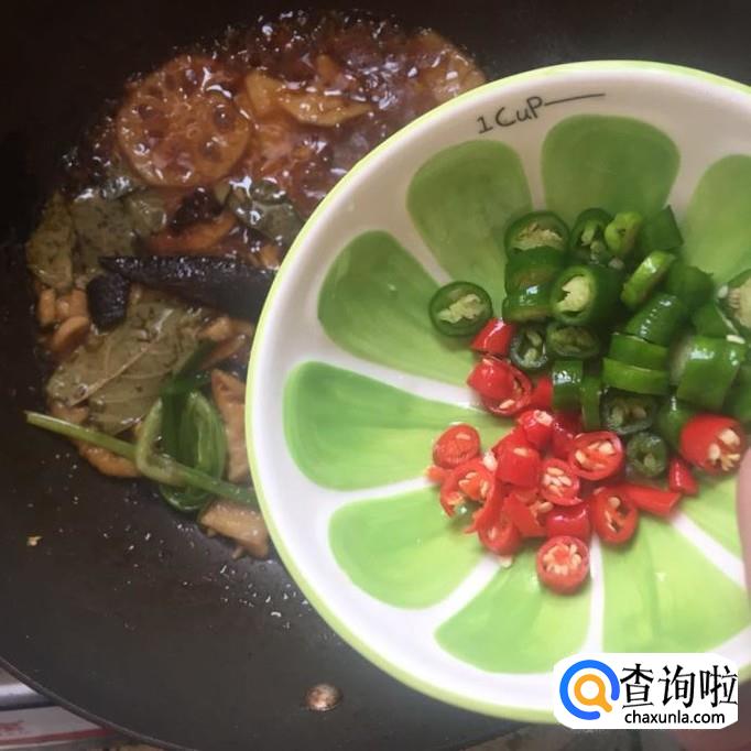 莲藕,玉米淀粉,食用油,桂皮,八角,香叶,香葱,蒜头,黄辣椒,绿辣椒,红辣椒,老酒,酱油,白糖。