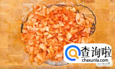 取4个番茄,用开水烫几分钟后,剥去外皮。去掉番茄籽和番茄蒂,将其切碎。