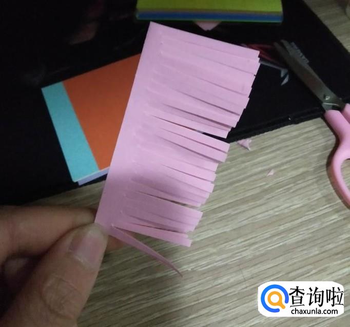 用粉色的纸包裹着黄色的纸, 如下图一,然后再将粉色的纸如图2所示的样子裹起来,完成后如图3,用胶水将其末端粘起来。