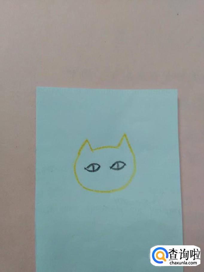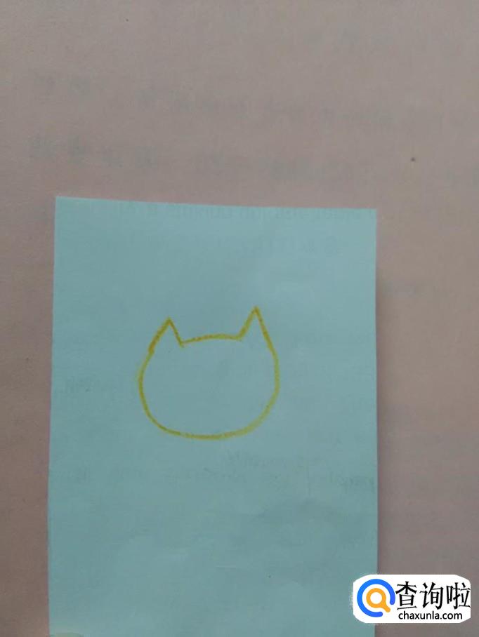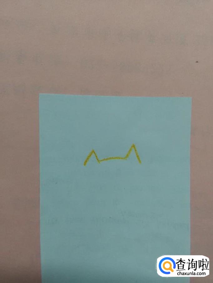 先用桔色的在纸上画两个连在一起的三角形,表示猫的耳朵和头顶。