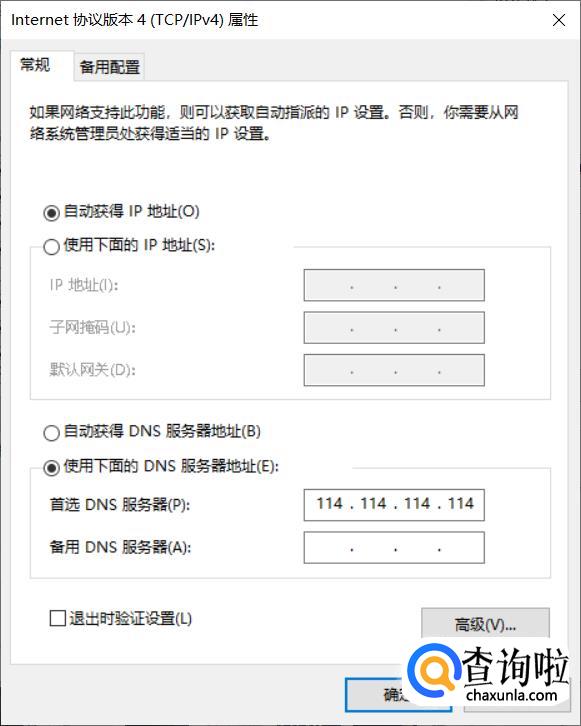 然后在里面选中使用下面DNS服务器地址。填写首选地址114.114.114.114。点击确定就可以了。