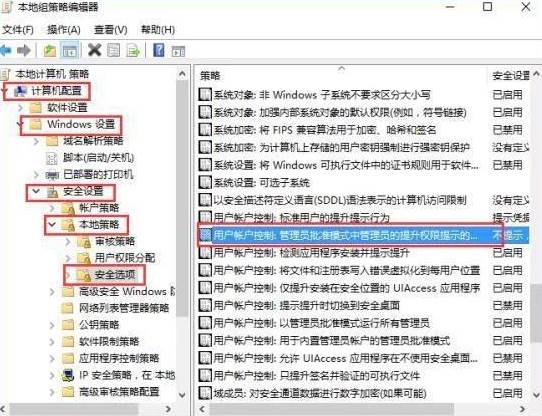 2、在翻开的窗口中,依次展开到“计算机设置--Windows设置--安全设置--本地战略--安全选项”,在右侧找到“用户账户操控:管理员批准模式中管理员的提升权限提示的行为”;