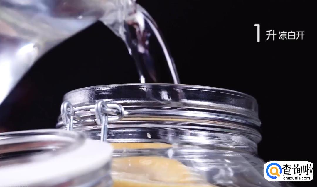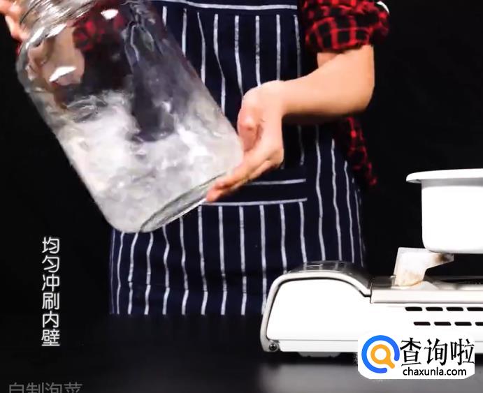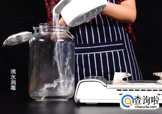 将煮开的沸水倒入泡菜罐中,用手来回摇晃泡菜罐,使沸水均匀冲刷泡菜罐内壁,起到消毒的作用。消毒完成后,将泡菜罐中的水倒掉并晾干水。