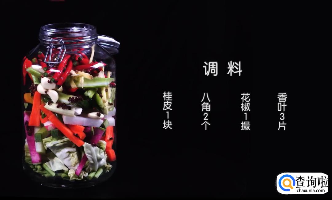 泡菜料:桂皮1块、八角2个、花椒1撮、香叶3片、凉白开1升、盐40克、糖20克、醋35克、酒20克