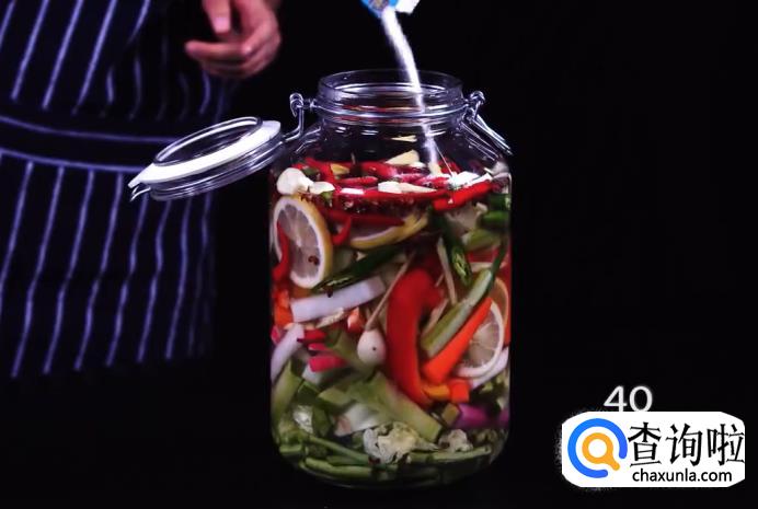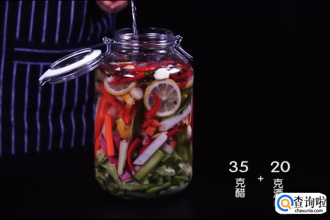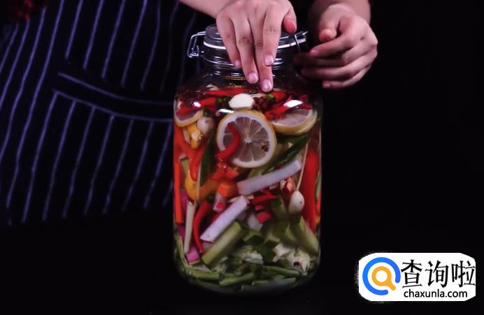 将之前处理好的蔬菜,全部放入泡菜罐中,放好后再加入桂皮1块、八角2个、花椒1撮、香叶3片、凉白开1升、盐40克、糖20克、醋35克、酒20克。最后盖上盖子,腌制一天即可食用。