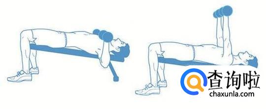 方法:两手各握一哑铃,肘部内收,夹胸。向上推起。整个过程保持背部的夹紧。
