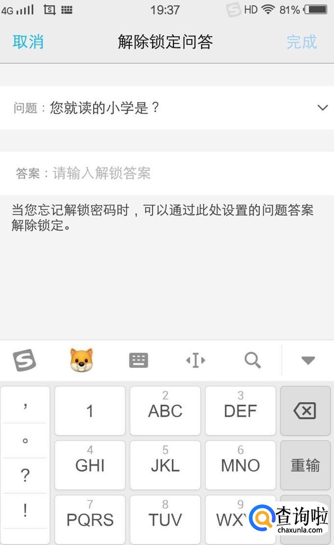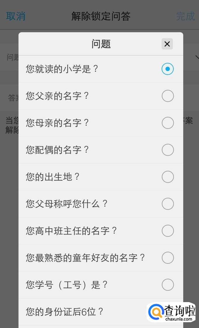 确定后会弹出“解除锁定问答”,点击设置问题后确认并保存。