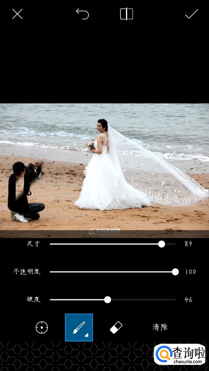 这里我们将左边的摄影师和下方的水印看作是多余的,首先点击选取工具,在临近的沙滩上点一下,松开手后,工具自动跳转到画笔上,我们调整画笔的参数,对人物进行涂抹,重复选取,涂抹这两个动作,最后将人物水印整个的清除