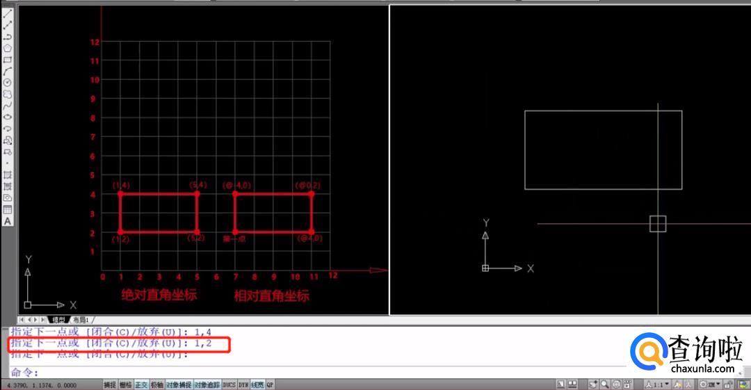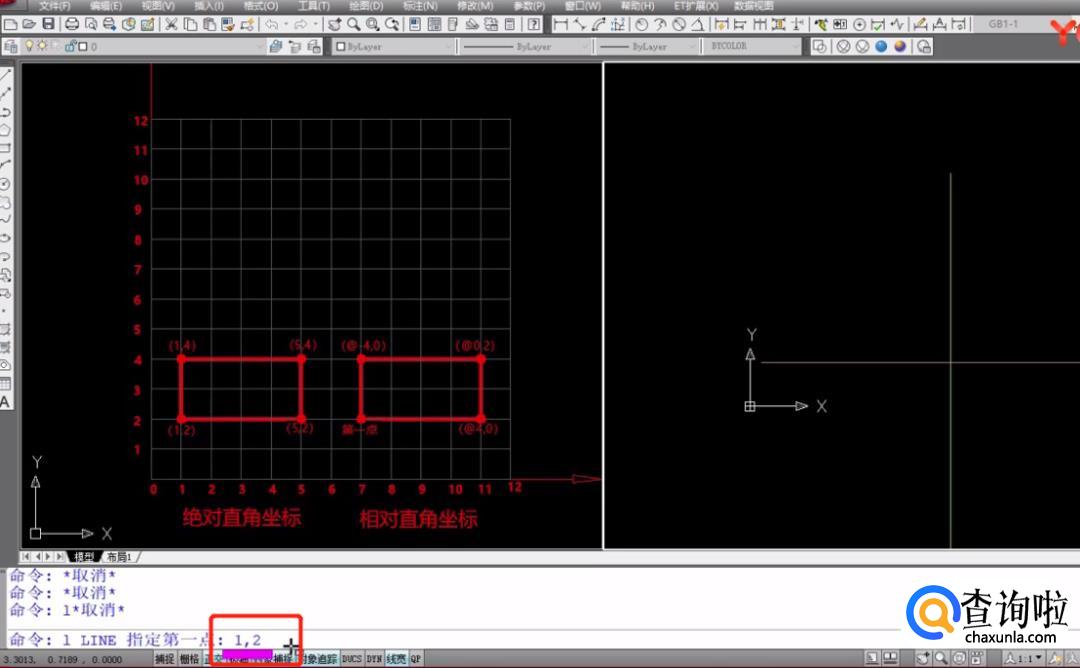 在键盘按下“直线”命名快捷键“L”,输入“1,2”定第一个点。