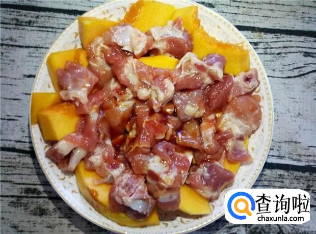然后再把腌制好的排骨一块块均匀铺在南瓜上面,然后放上蒸笼上蒸。