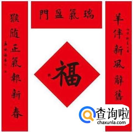 三是联披互补、相辅相成,如,“减负恤民,浩浩东风常送暖;扶贫解困,潇潇春雨总关情”的横批是“前程似锦”,则是与对联相互补充,相辅相成,既揭示出百姓对党中央“常送暖”和“总关情”的无比感激之情,也赞颂了党前程远大,辉煌灿烂。横披多为四字,过去写横披是从右往左横写,现今多从左往右写,从右自左写当属正式写法。贴横披应贴在门楣的正中间,其字体应与上下联风格一致,上下呼应。