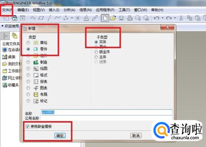 然后在弹出的“新建”对话框中选择我们需要的设置:类型为零件,子类型为实体,