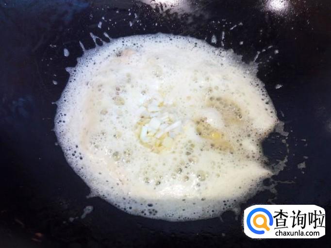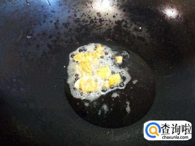 锅里放入油加热,油热后放入蛋黄,小火翻炒。炒至蛋黄起沫后,放入料酒,葱,姜翻炒。