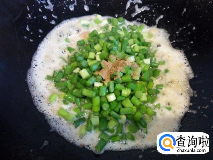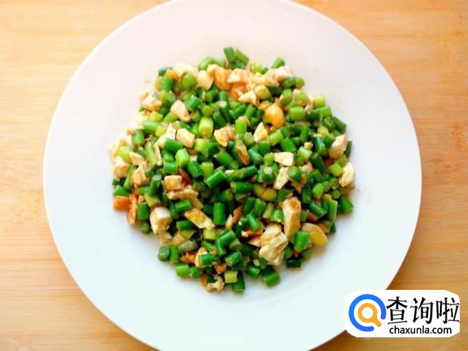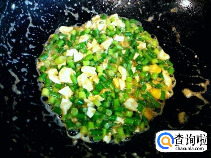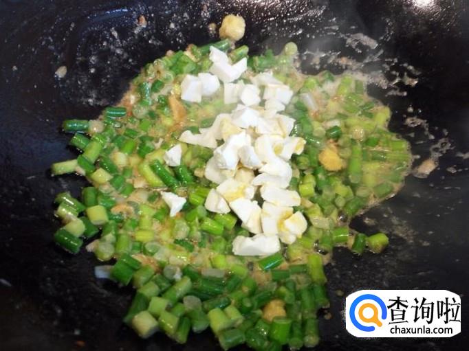 蒜薹略翻炒一下,放入切好的蛋白翻炒。