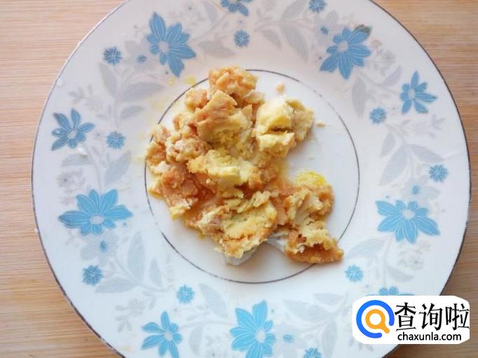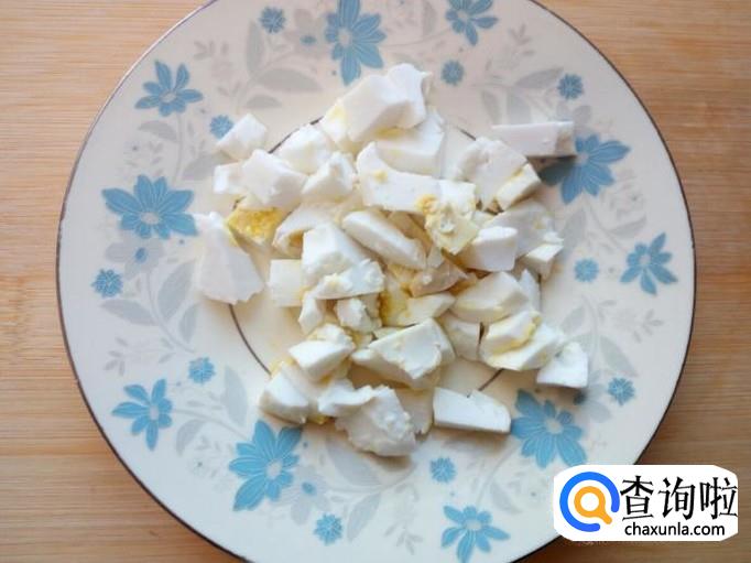 咸鸭蛋剥去皮,把蛋黄,蛋白分离。蛋黄用匙儿捣碎,蛋白切成小块。
