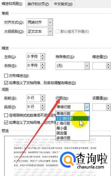 在弹出的页面中,在行距部分根据自己需要选择行距倍数或者其他选项。