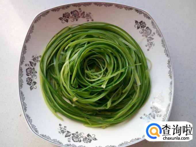 把沥干水分的蒜薹,用手撕成丝,装盘备用(撕成蒜薹丝的粗细,没有具体要求)。
