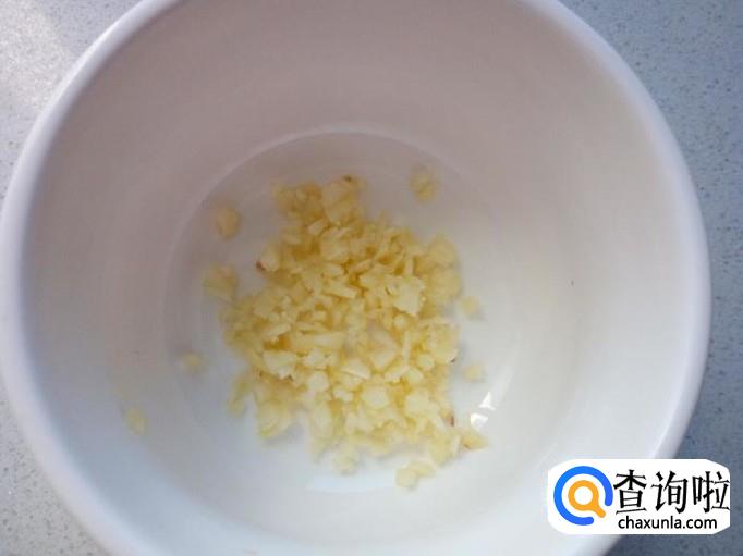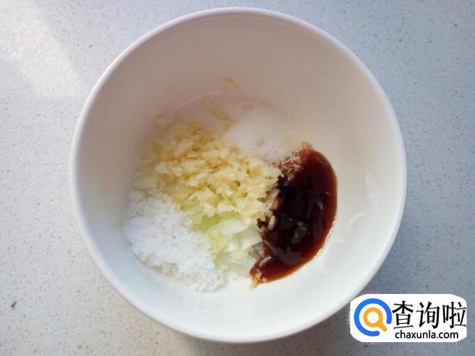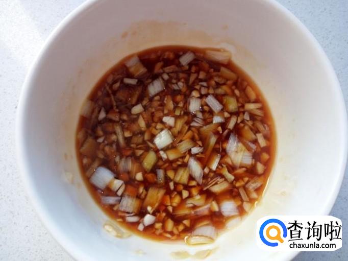 把切好的葱,蒜末,放入碗中。放入盐,味精,白糖,少许蚝油,少许酱油,兑少量水,调和成料汁。