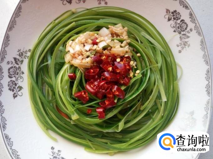 锅内放入适量的油加热,油七,八成热时关火。把热油泼在装有蒜薹丝盘中的红干椒上。食用的时候拌和均匀即可。