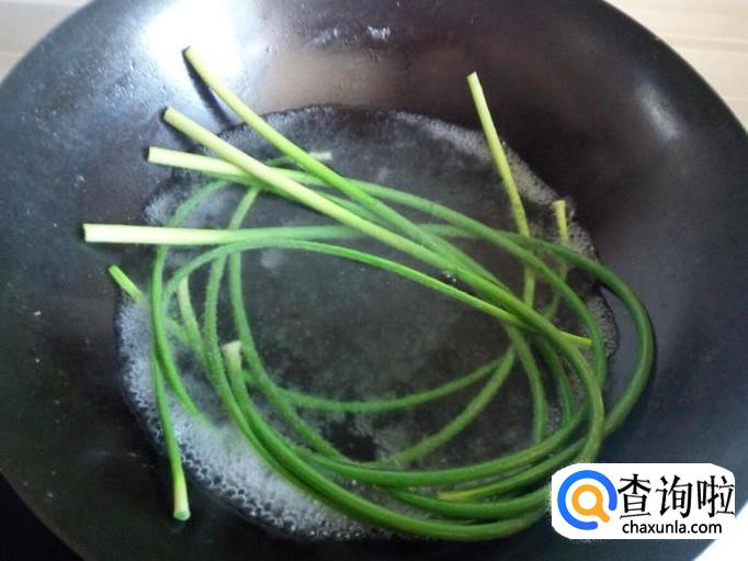 把蒜薹放入开水中焯一下,煮至八分熟捞出,用冷水过凉,沥干水分。