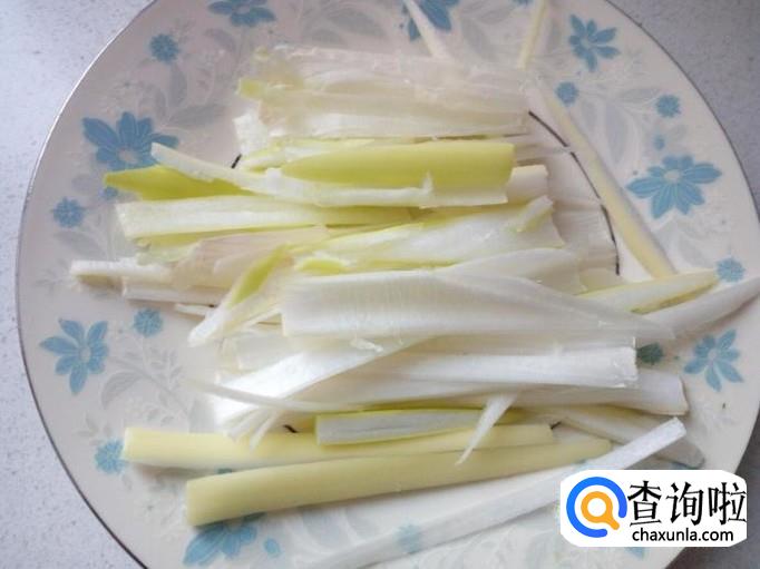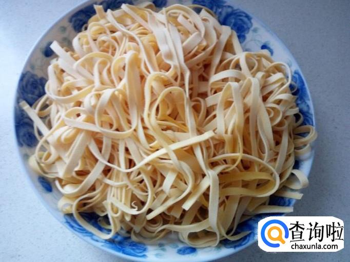 干豆腐用水冲洗一下,然后切成丝。
