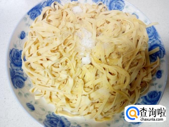 开水煮一分钟左右的时间,干豆腐丝变软后捞出装盘,放入少许白糖,盐,味精。