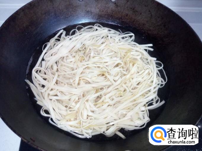 锅内放入凉水烧开,水开后干豆腐丝入锅焯一下。