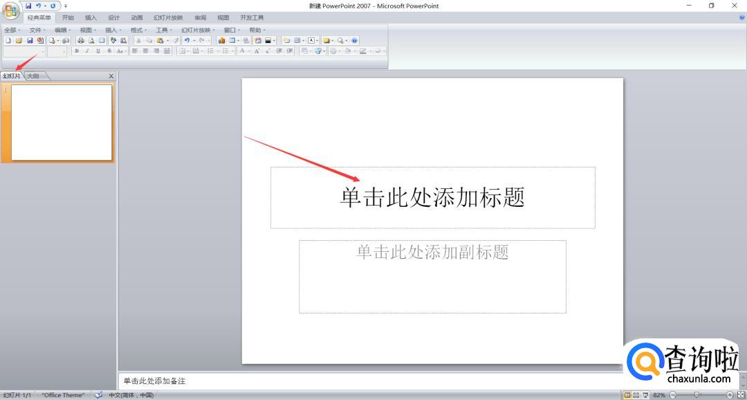 打开新建好的PPT演示文稿,可以看到一个幻灯片1,这是幻灯片的首页我们可以对我们做的内容给到一个标题,在【单击此处添加标题】写上我们的标题。