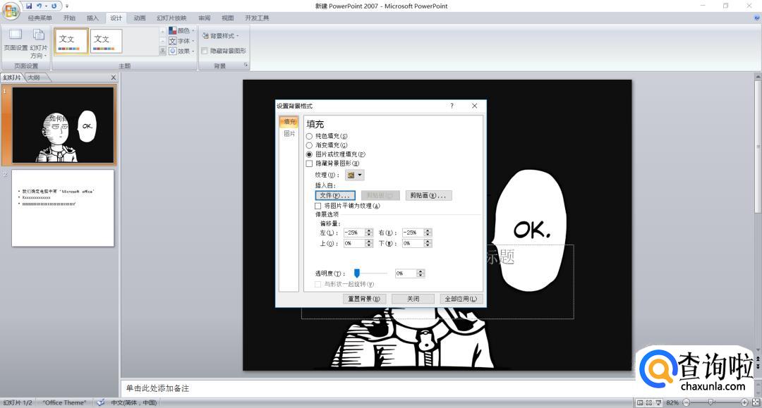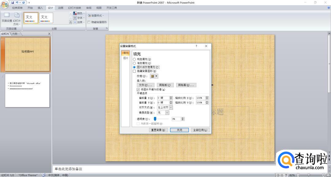 弹出新的任务框中我们选择【背景或纹理填充】,可以看到现在已经有了新的背景颜色了。注意这里的背景图片是系统自带的一些可以供选择。