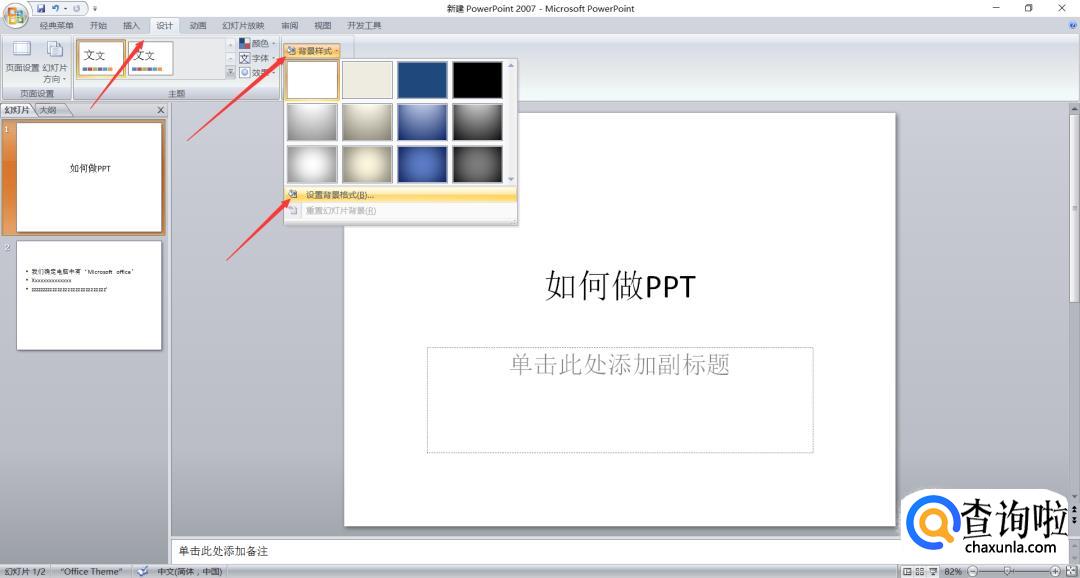 编辑完内容后,我们可以给PPT设置背景图。点击【设计】→【背景样式】→【设置背景格式】。