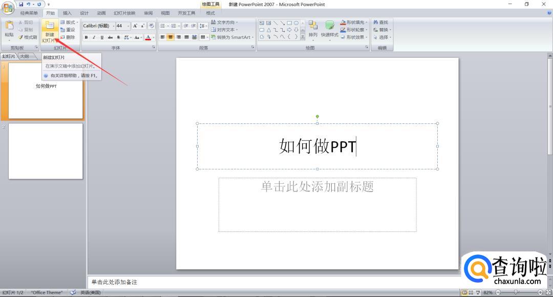 然后,我们需要添加第二页的话,点击左上方【开始】→【新建幻灯片】。