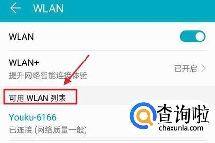 点击此项即可看到目前我们连接的无线网名称了,点击名称以后在WLAN页面可以看到附近可用的所有的无线网列表;