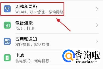 首先在华为手机桌面是点击“设置”,然后在设置页面找到“无线和网络”选项,如图二...
