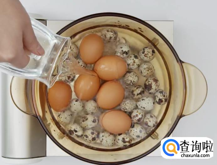 首先把鹌鹑蛋和鸡蛋冷水入锅,开火煮熟。