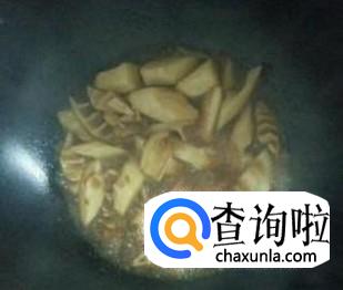 锅中加油,油8分热时加入葱姜蒜,老抽,豆瓣酱,爆炒,然后加入竹笋。翻炒均匀,然后我们加一点点水进去,盖上锅盖,煮10分钟左右。