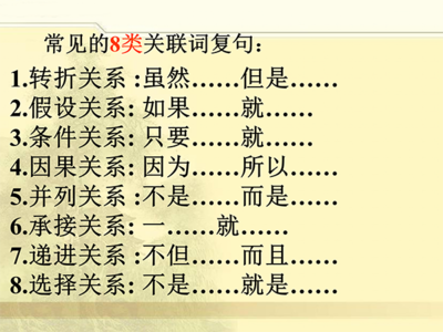 种类大致可分为:并列、递进、转折、承接、因果、条件、选择和假设等八种。