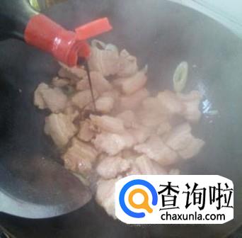 锅中加一点点油,油热时加入猪肉,翻炒,待其透明时加入一点点的老抽,豆瓣酱,翻炒。