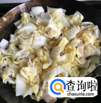 然后我们向其中加入白菜块,翻炒至白菜熟,加蒜苗,葱,盐,味精,花椒,起锅,就ok了。