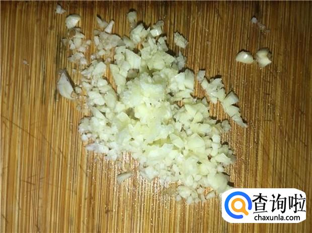 蒜头用刀背拍扁,剁成蒜蓉。