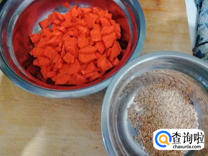 准备工作做完后,取豆浆机打开盖,先放入泡好的豆子花生麦仁,在放芝麻和切好的红萝卜,食材都放进去后就等加水。