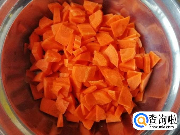 把洗净备好的胡萝卜切小丁,我是选择竖着把胡萝卜从中间切开,一分为二,然后把平的一面挨着菜板,从中再分一半,也就是一根胡萝卜分四份,然后横着切片,最好薄点如图就可以。