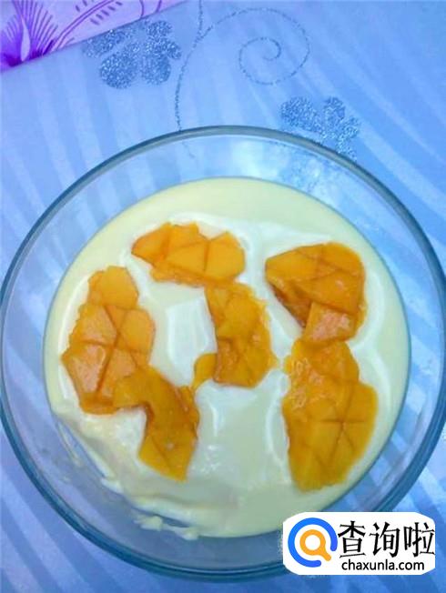 切一个芒果,只要里面的芒果肉,切成小块放进大碗里,然后加入一盒温热的纯牛奶,加入一勺子蜂蜜搅拌。
