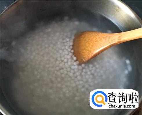 锅烧开水,把西米放进去煮,不断加热,用漏勺不断的翻搅,大概煮十五到二十分钟的时候西米基本上煮好了。