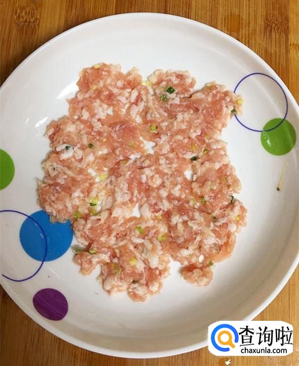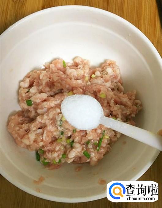 再加入少许水,搅打上劲,然后加入葱花和小勺盐,拌匀。
