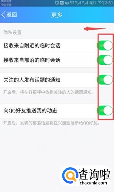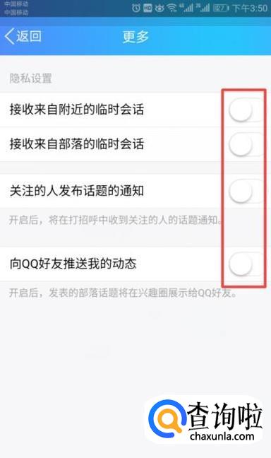 弹出的界面,我们将里面的开关全部向左滑动,结果如图所示,这样就全部关闭了,这样我们也就将手机QQ的兴趣部落消息推送给取消了。