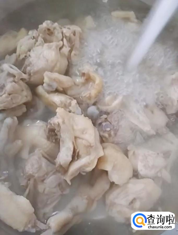 然后我们起锅烧水,放入鸡块焯一下捞出,在凉水里面过凉备用