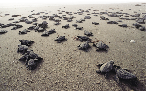 海龟整天生活在海里,哪里有吃的就往哪里去,好像居无定所。可是,等到海龟妈妈要产卵的时候,它们却不约而同地来到自己出生的地方。小海龟呢?当它们从龟壳里孵化出来后,也顾不上欣赏海边的风景,而是争先恐后地爬向大海,然后各奔东西。可是过了几年,当它们要成为海龟妈妈的时候,又会从海洋的不同地方,再一次聚集到这片沙滩上,无论路途多么遥远艰辛,无论旅程多么曲折危险。那么,这些海龟是怎么认识“回家”之路的呢?