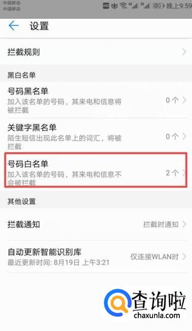 弹出的界面,我们点击号码白名单;