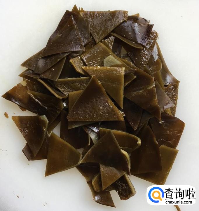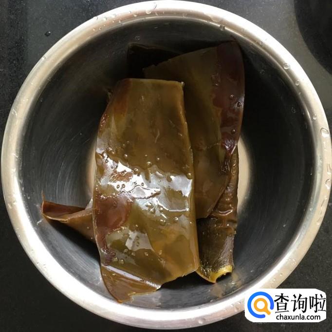 干海带清洗干净泥沙放入锅中蒸30分钟,取出用凉水泡发3至5个小时后切成块备用