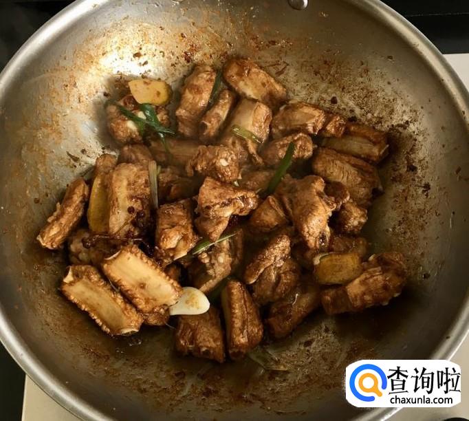 热锅加入适量的花生油倒入泡好并沥干水分的排骨翻炒至没有水分,加入葱段、姜片、蒜片、八角、花椒炒香
